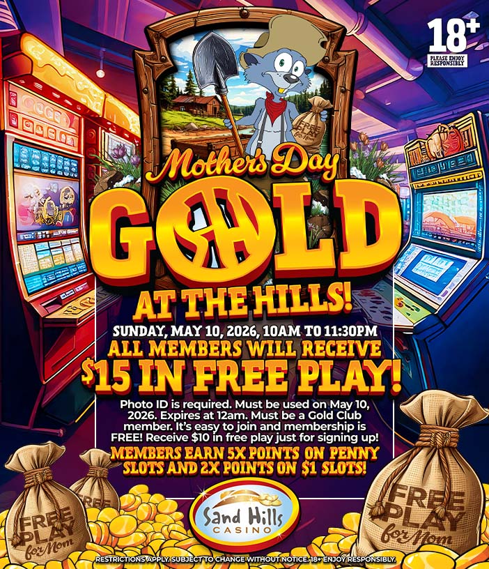 Some conditions apply. Subject to change without notice. Sand Hills Casino has the right to discontinue this promotion at any time. Please visit the Gold Club for more information.