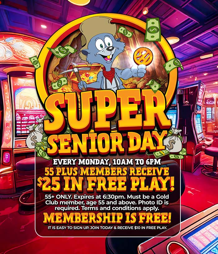Every Monday, 10am to 6pm. Expires at 6:30pm. It pays to be a 55+ Gold Club Member! Visit the Gold Club on Super Senior Day and receive $25 in free play. Photo ID required. Membership is required. It is free to join. Restrictions apply.